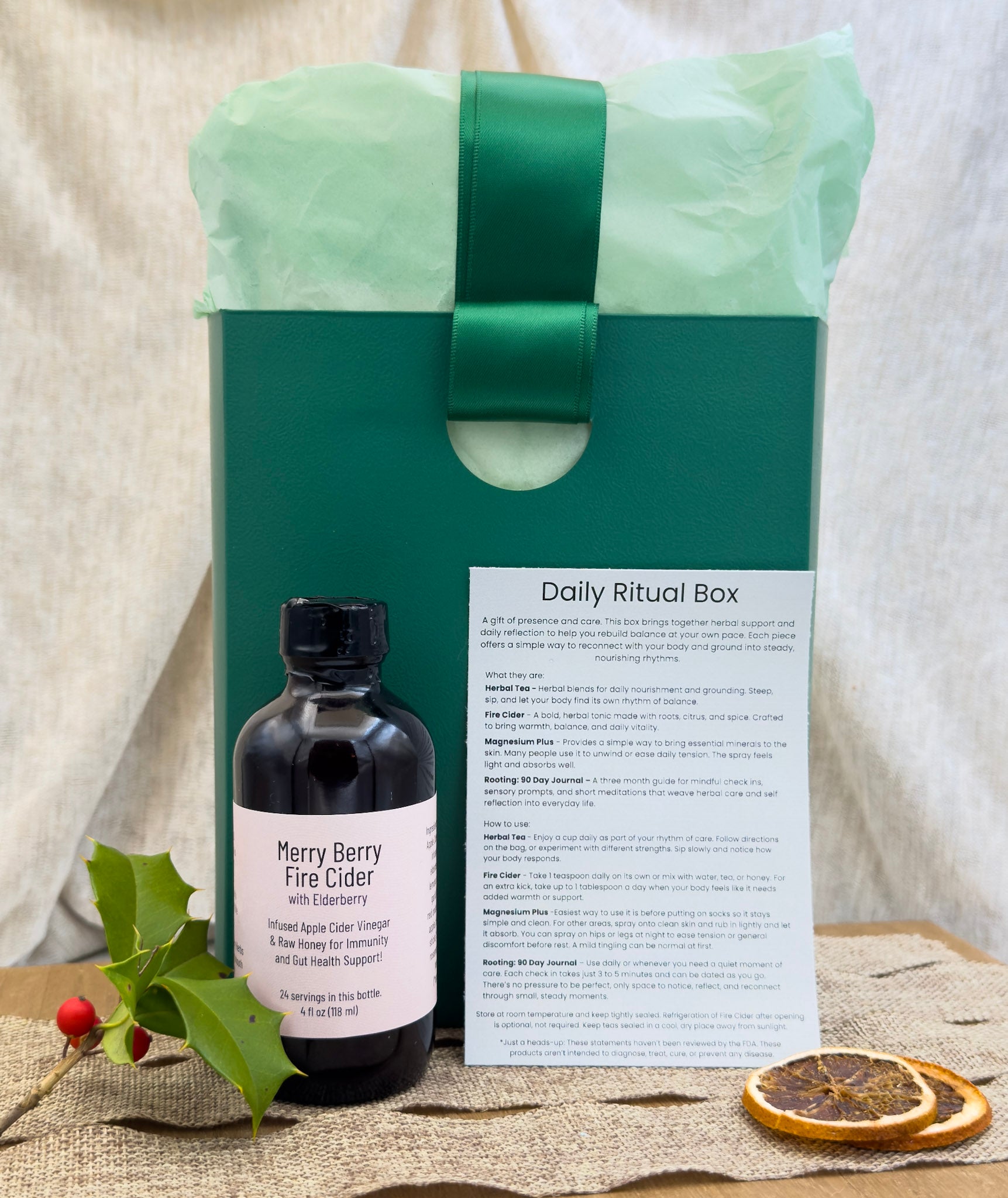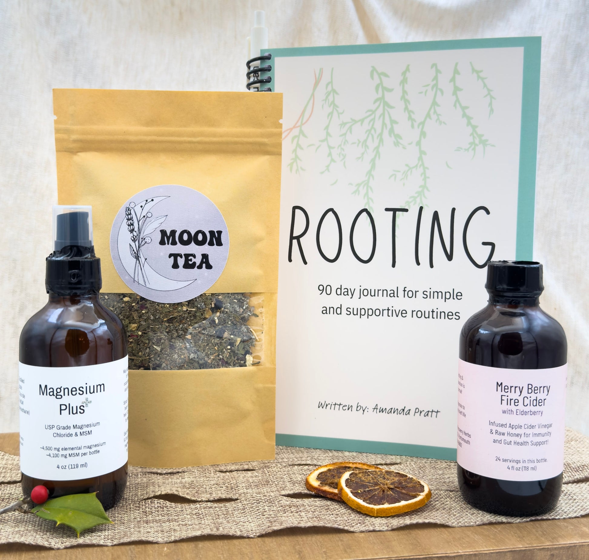 The Daily Ritual Box was created to bring ease and rhythm back into daily life. Each piece offers simple, steady care through small moments that nourish the body and support gentle consistency. Sip tea that restores, let Fire Cider awaken the system, soften into calm with Magnesium Plus, and settle into reflection with your Rooting: 90 Day Journal.