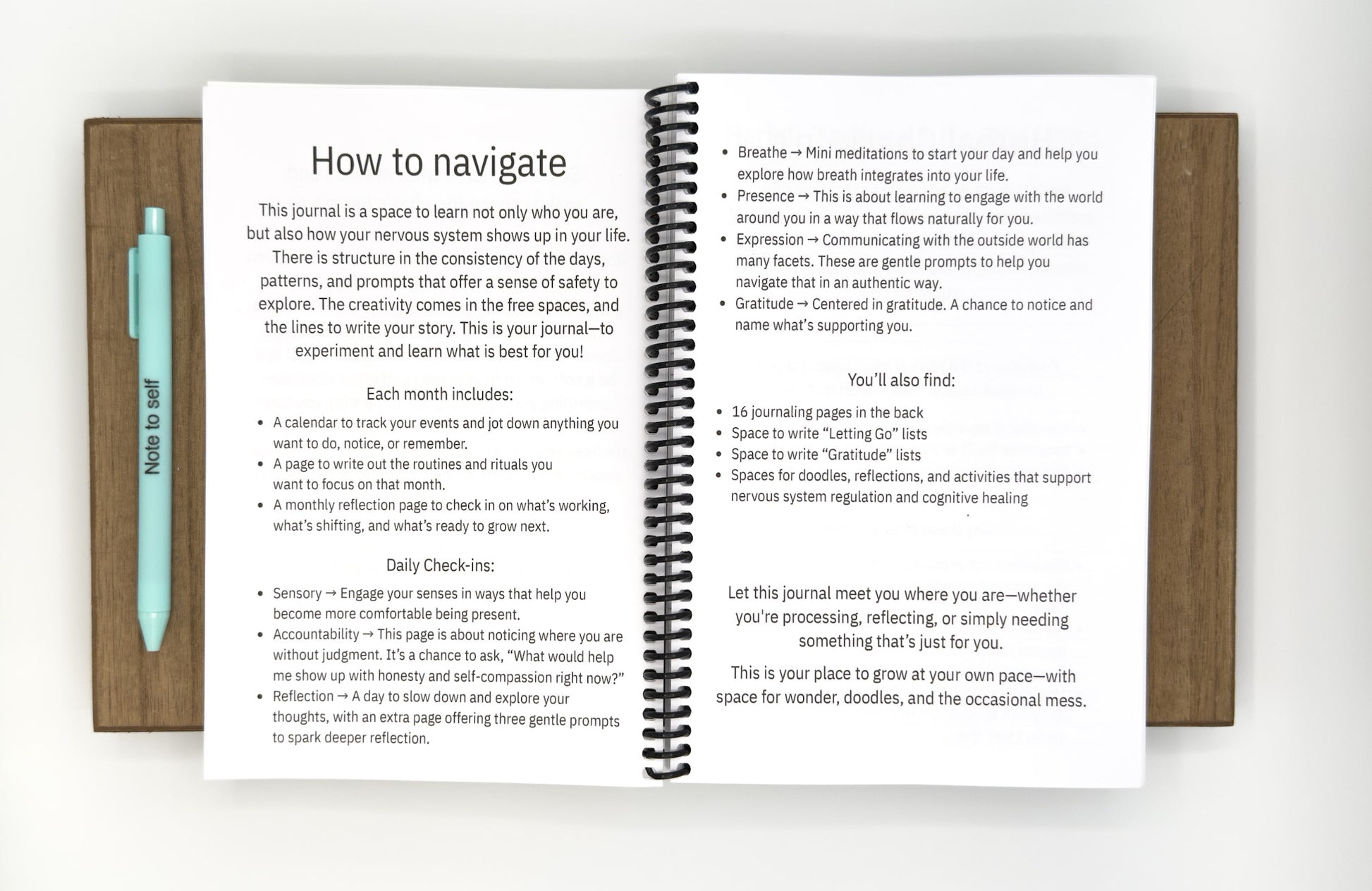 Life feels like it's always moving and changing. New routines, especially healing ones can be overwhelming to bring into everyday life. This journal was designed to walk you into the simple healing flow that’s available to everyone. Slow down for 2–5 minutes a day to read trauma-informed reflections and sensory-based prompts designed to ground you gently in the present moment and answer simple questions about what you experience daily. Every day of this 3 month companion journal is centered around stepping into your body, your feelings, and everything that makes you, you. This cyclical journal has daily themes and “mini themes” to take you on a healing journey of your own. It doesn’t have to be grand gestures and hours of reflection to move you into a more stable and comfortable space.