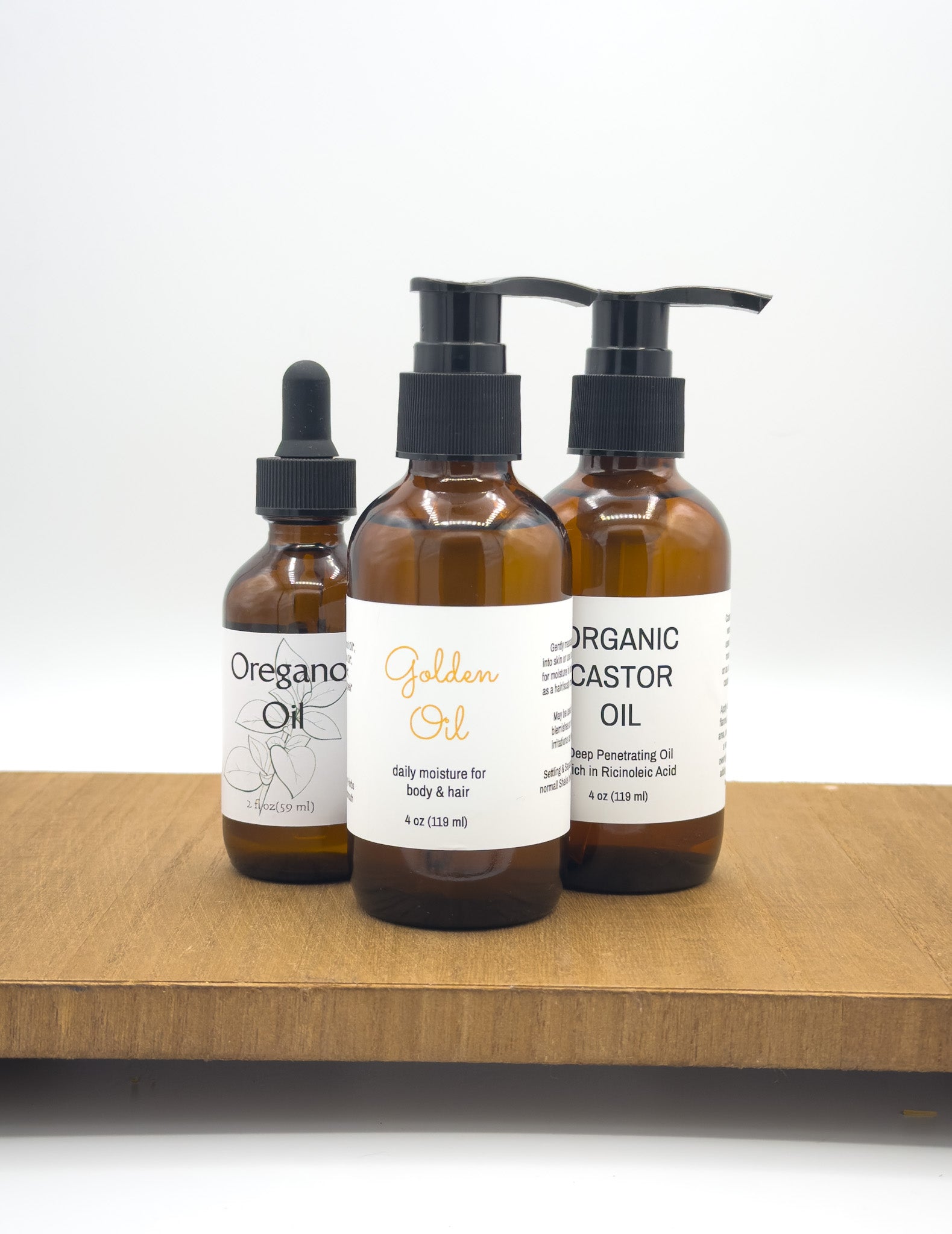 - Golden Oil blends together nourishing oils and supportive herbs. It’s crafted to soothe and moisturize the skin, offering both everyday hydration and a touch of herbal care to your self-care routine.